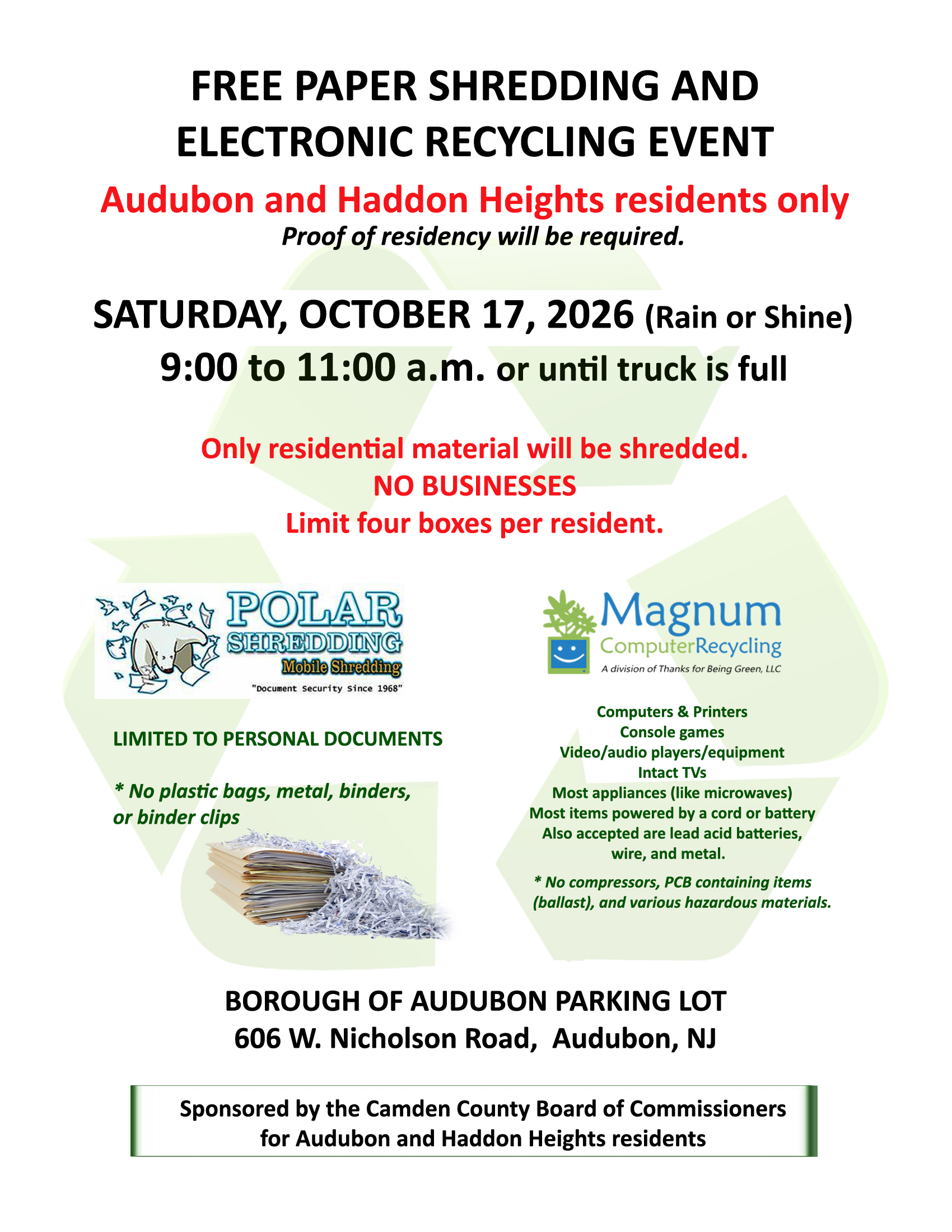 Join us for a Paper Shredding and Electronics Waste Collection Event for Audubon and Haddon Heights residents in cooperation with the Camden County Board of Commissioners.